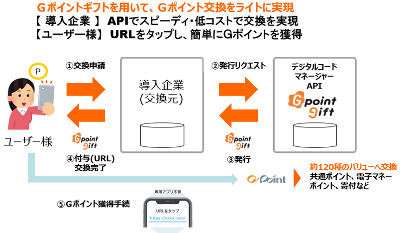 「Gポイントギフト」はAPIで発行可能なため、導入企業にとってポイント交換プログラムを一から構築するのと比べ、スピーディ・低コストで他社のポイントの交換サービスを実現できるというメリットがあります。