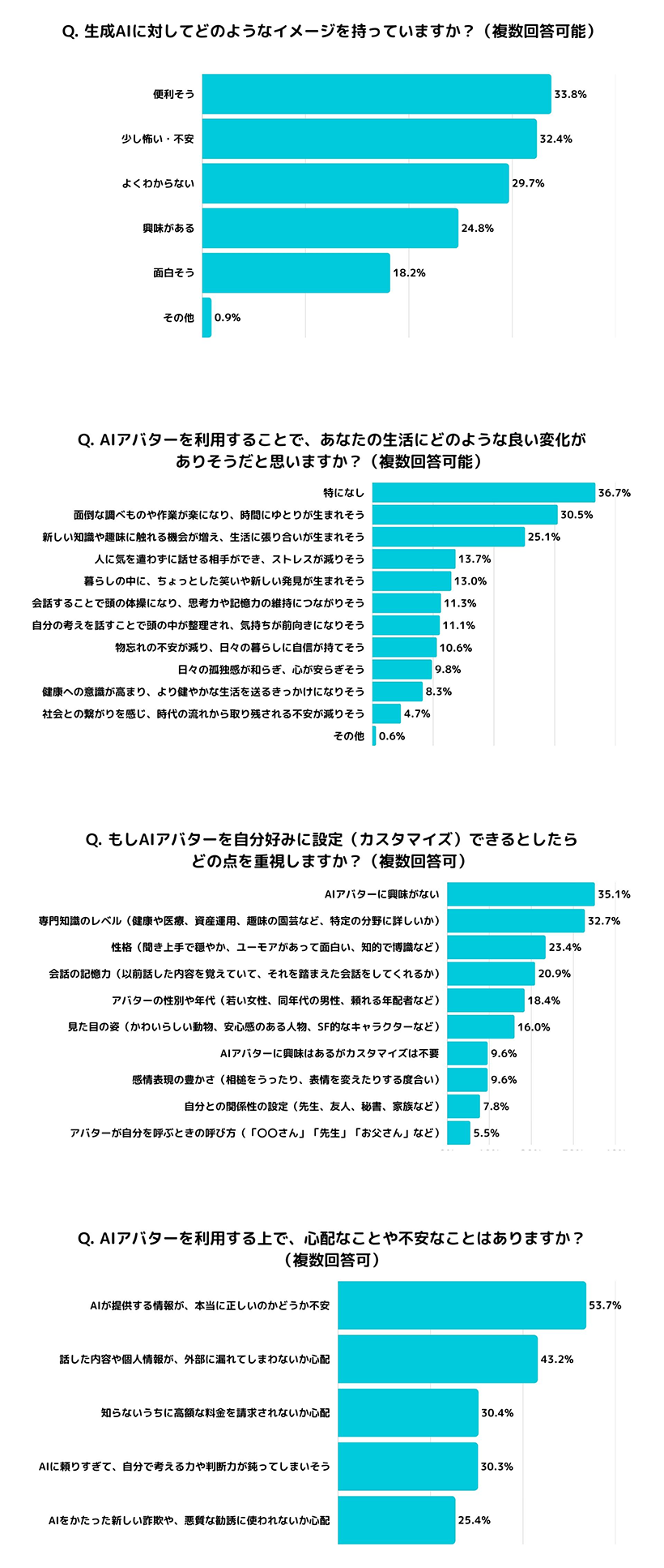 「話した内容や個人情報が、外部に漏れてしまわないか心配」(43.2%)や「知らないうちに高額な料金を請求されないか心配」(30.4%)も普及を妨げる一因として挙げられました。