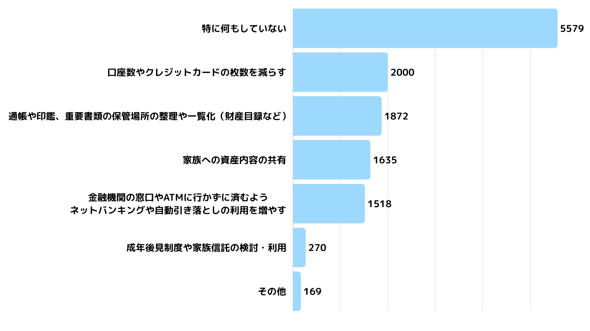加齢による判断能力低下(認知症など)に「不安を感じている」人は7割以上に達しました。しかし、その対策として具体的に行動している人は少なく、5,579人(過半数)が「特に何もしていない」というギャップが存在します。